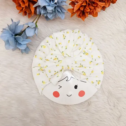 Baby Turban Cap With A Delicate Green Floral Print And A Large Decorative Bow On The Front