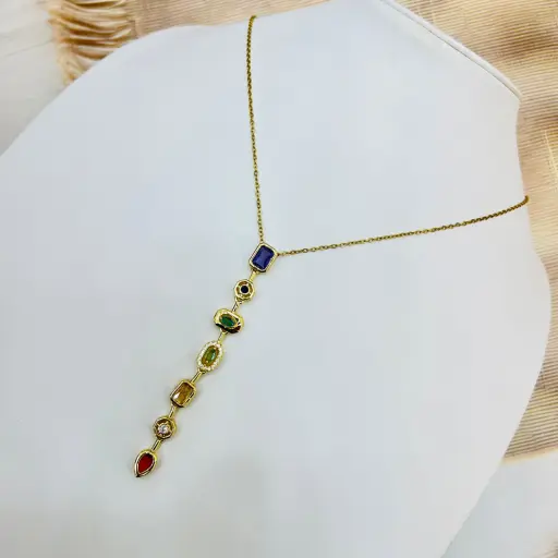 Gold-Toned Y-style Necklace With Multi-Colored Gemstone